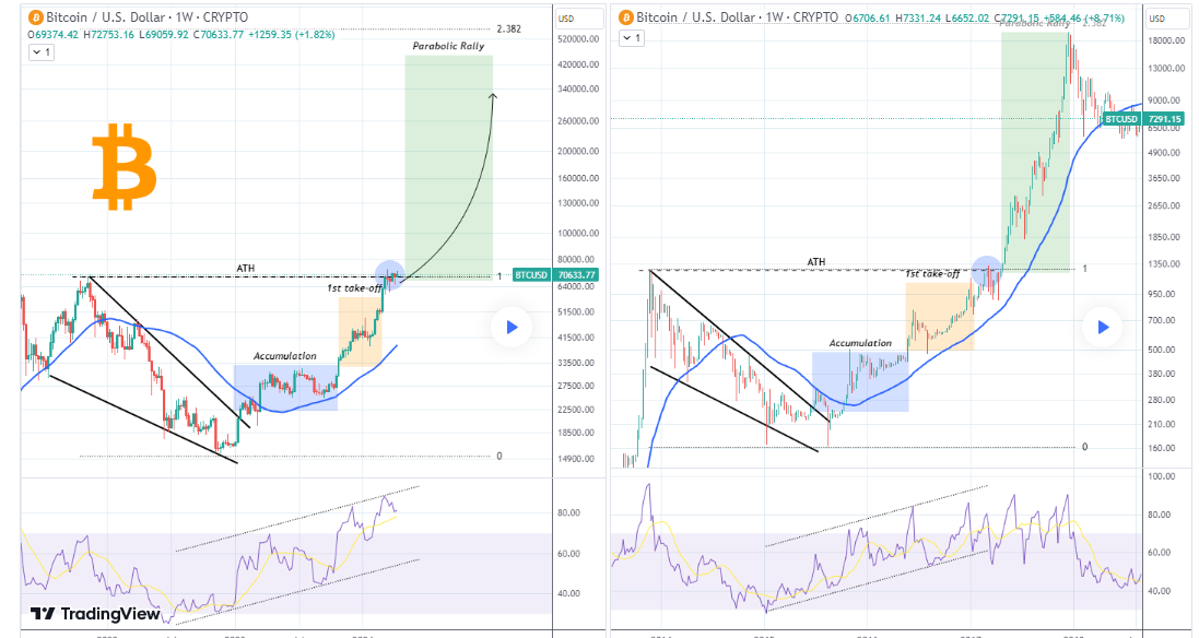 TradingShot pointed out similarities between the current situation and past cycles. Both cycles began with a falling wedge pattern leading to a bottom, followed by an accumulation phase once the price broke above the 1W MA50 (Weekly Moving Average 50). This initial surge led to the first take-off phase to test the record high.