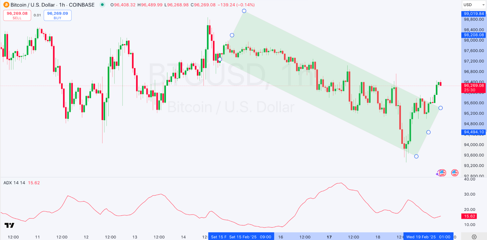 Following rallying from the channel’s lower boundary near $94,494, BTC/USD trades at $96,269. The breakout above the descending channel indicates a shift in momentum, suggesting that buyers regain control.