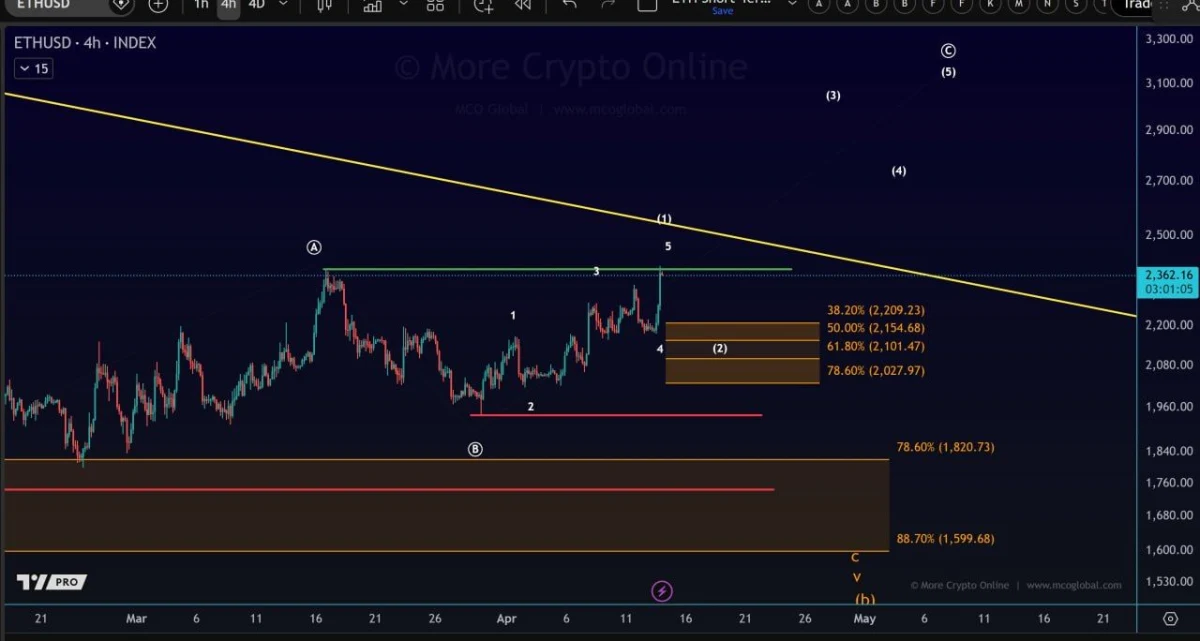 Meanwhile, This 4-hour ETHUSD chart shows Ethereum moving in a corrective upside structure that MCO Global says is similar to Bitcoin’s recent setup. Price has pushed into the $2,360 area and is testing a key horizontal resistance zone while still trading below a descending trendline. That means the rally remains active, but it is also approaching a decision area.