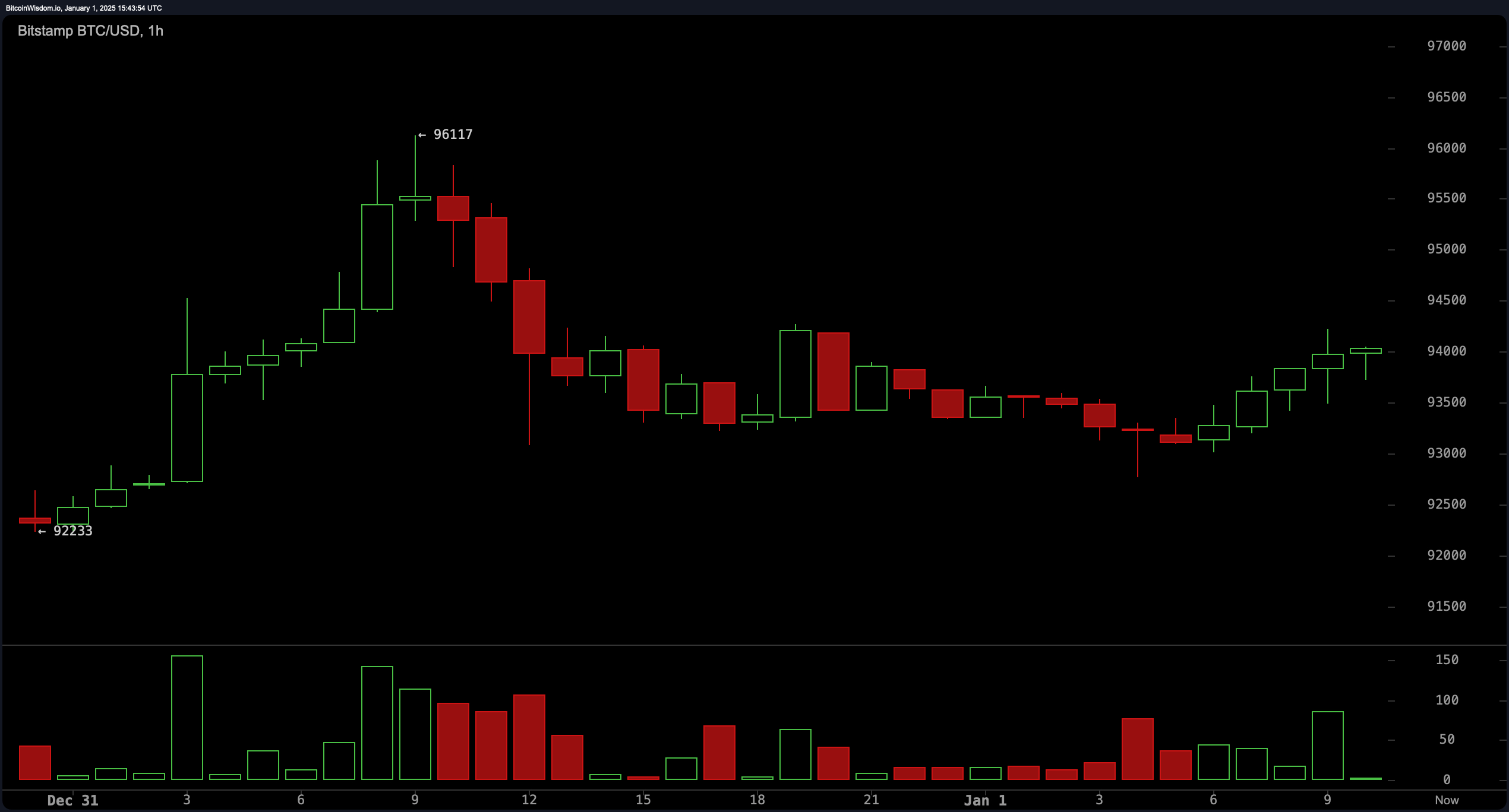 BTC/USD 1H via Bitstamp on the first day of 2025.