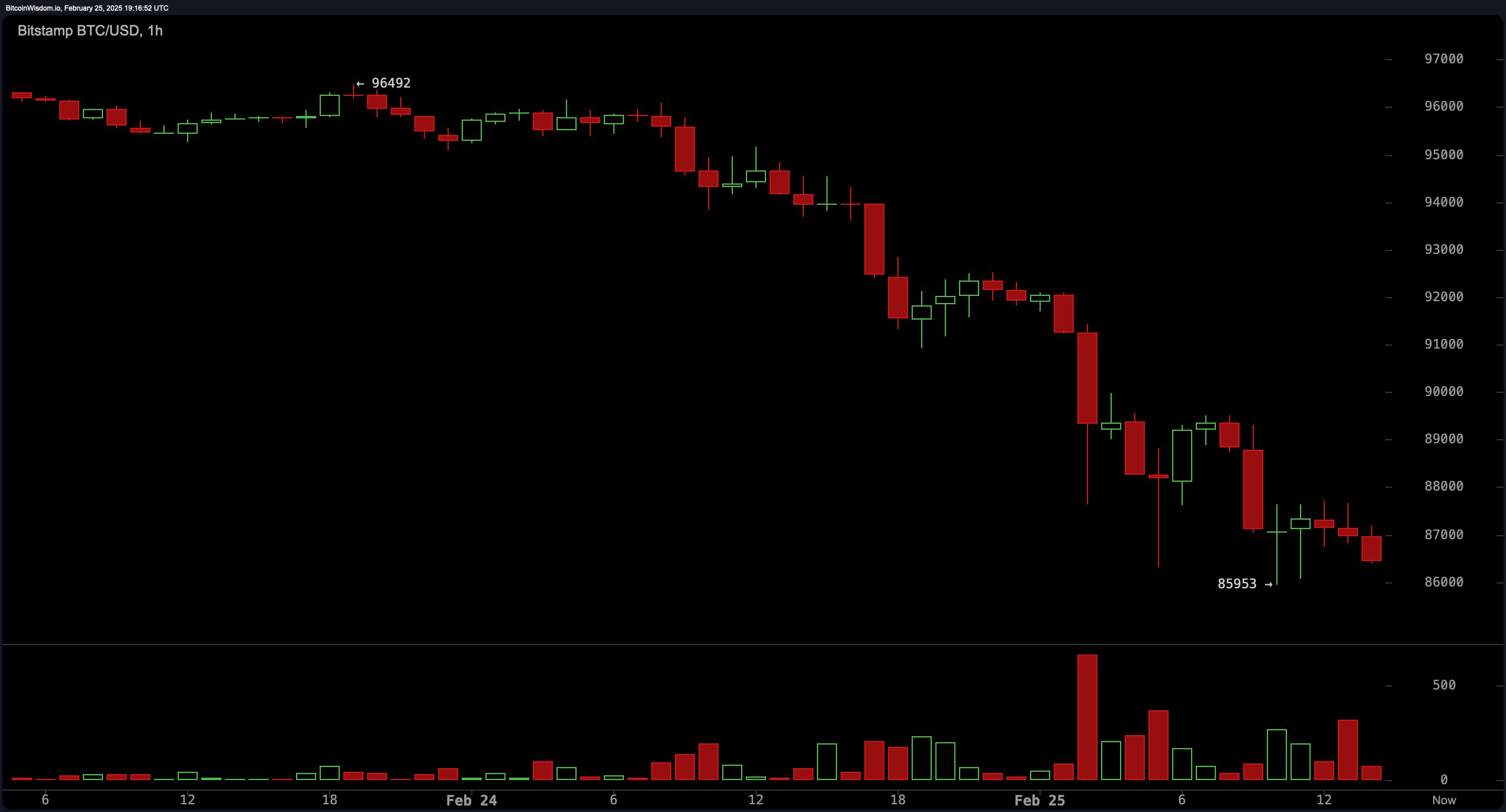 Bitcoin traded at $86,473 at 2:25 p.m. ET on February 25, 2025, with a market capitalization of $1.72 trillion, a 24-hour trade volume of $98 billion, and an intraday price range between $85,953 and $94,587.