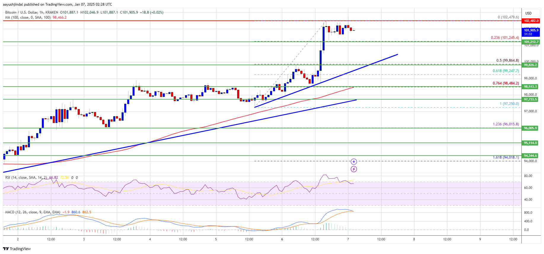 The price was able to clear many hurdles near the $100,000 level. It even spiked above $102,000. A high was formed at $102,479 and the price is now consolidating gains above the 23.6% Fib retracement level of the recent upward move from the $97,251 swing low to the $102,479 high.