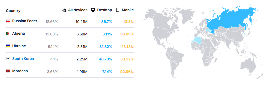 Bybit receives most of its site traffic from the Russian Federation, where USDT usage is not restricted. | Source: Semrush