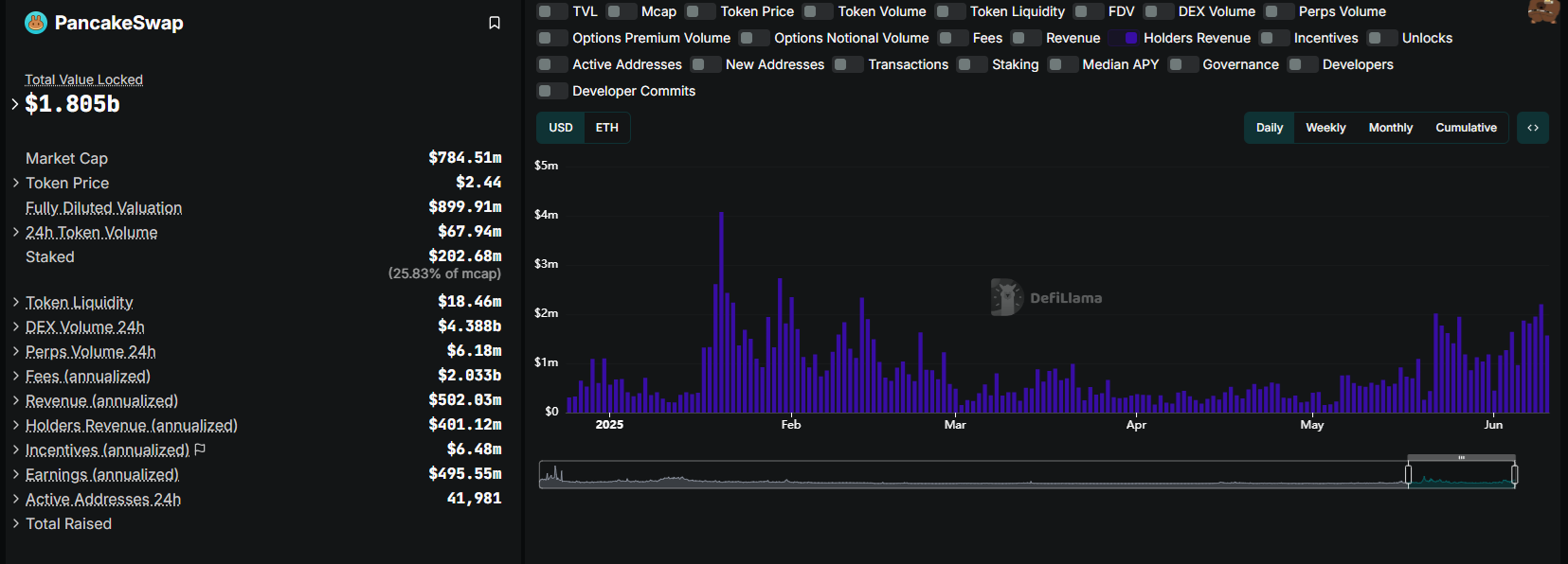 PancakeSwap has the biggest revenues per holder for CAKE, as the DEX fees returned to levels not seen since the 2021 bull market. | Source: DeFi Llama