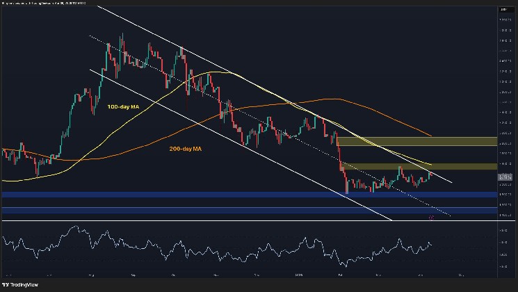 On the 4-hour chart, $ETH’s consolidation in the broad range between roughly $2k and $2.4k since early February is evident. The ascending trendline from the lows has been providing some short-term support. Moreover, the price has recently pushed back toward the upper end of the range, currently retesting the $2.15k area with the RSI above 50. This suggests near-term bullish momentum is building.