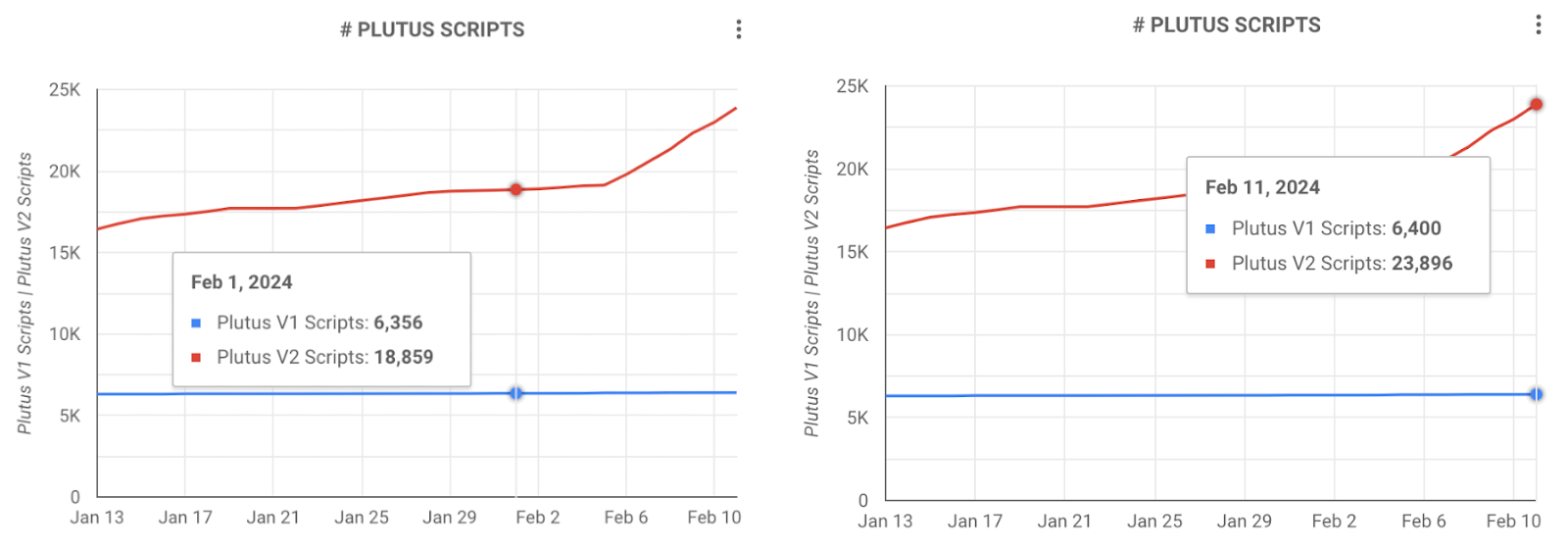 Plutus V2 scripts saw significantly more growth than Plutus V1 scripts, with the former starting the month with 18,859 and the latter 6,356.