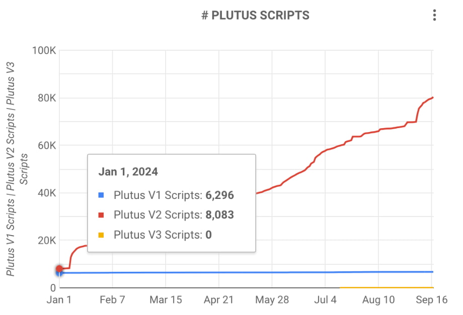 At the start of the year on January 1, there were 8,083 Plutus V2 scripts. Fast forward to September 18, and that number has skyrocketed to 80,437—an increase of 72,354 contracts.