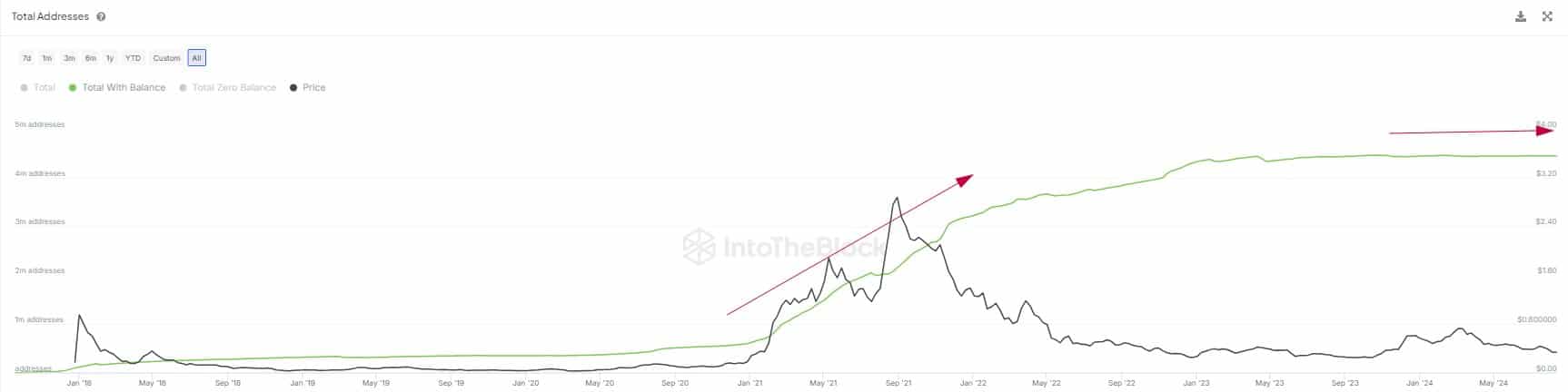 The addresses holding Cardano (ADA) have stagnated around 4.45 million wallets for over a year despite the network set for its biggest technical advancement.