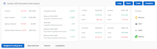 The derivatives market paints a mixed picture for Cardano. The trading volume dropped by 39.23%, reaching $275.93 million, reflecting cautious trading activity. Meanwhile, open interest rose slightly by 1.34% to $182.38 million, suggesting that more positions are being held despite lower trading activity.