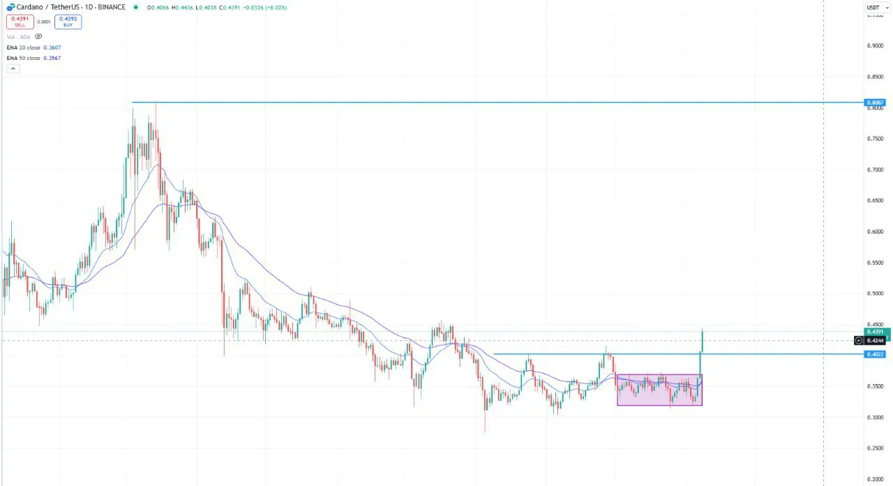 ADA is trading at $0.4358 and has broken above a daily range that was holding between $0.369 and $0.3189 from 2nd October to 8th November. The asset has also crossed the $0.4022 resistance and is currently trading above the 20 and 50 exponential moving averages, indicating strong bullish momentum.