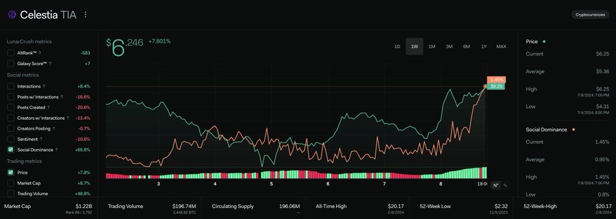 According to a tweet from social intelligence company LunarCrush, TIA has increased its social dominance, accounting for 1.45% of all cryptocurrency-related social media posts in the last few hours.