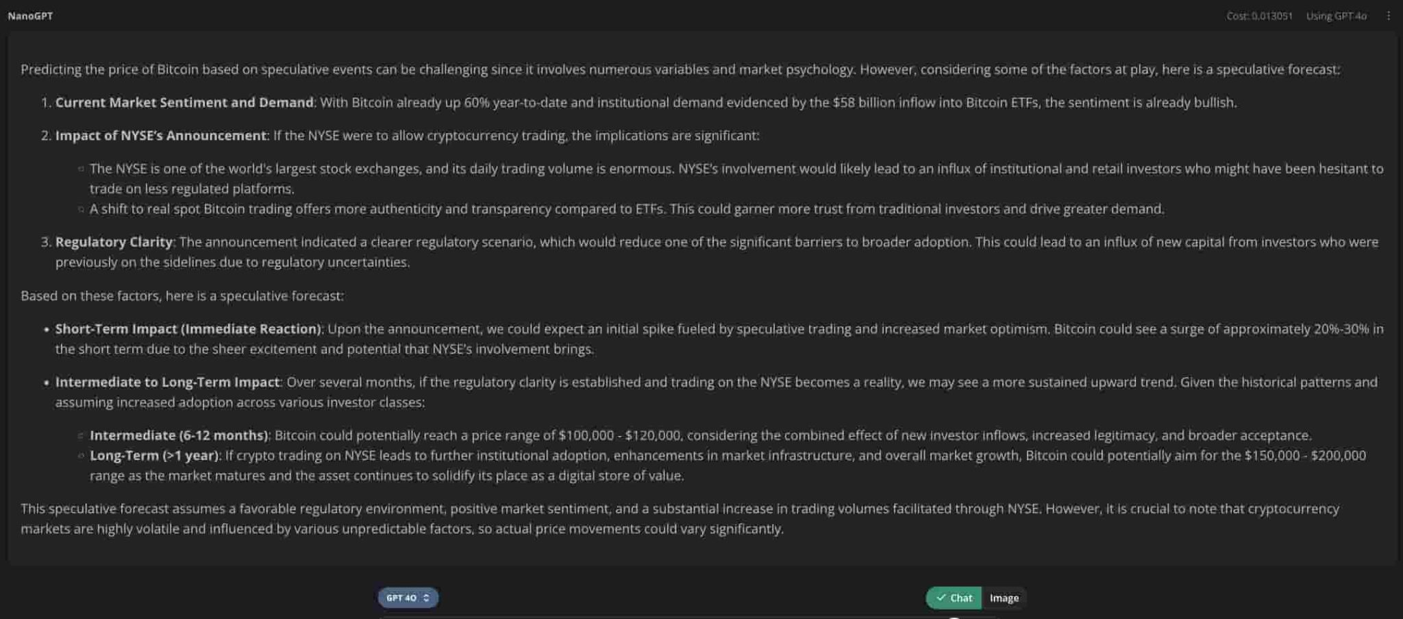 ChatGPT-4o Bitcoin price prediction in hypothetical NYSE listing