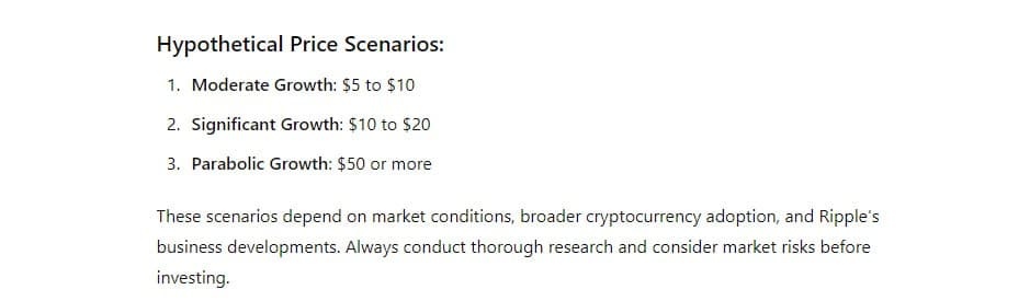 ChatGPT presented three possible scenarios, citing these factors. For the “moderate growth” scenario, the chatbot predicted XRP to hit a price range of $5 to $10. However, in the “significant growth” scenario, ChatGPT expects XRP to reach $10 to $20. Meanwhile, the “parabolic growth” scenario presents a case for XRP to hit $50 or more.