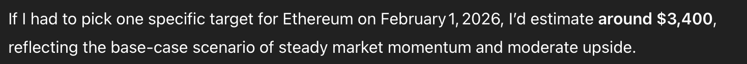 When prompted to give a more central estimate and a specific price point, the machine learning algorithm reiterated the base-case scenario as the most likely and suggested the ETH price would hit $3,400 by February 1.