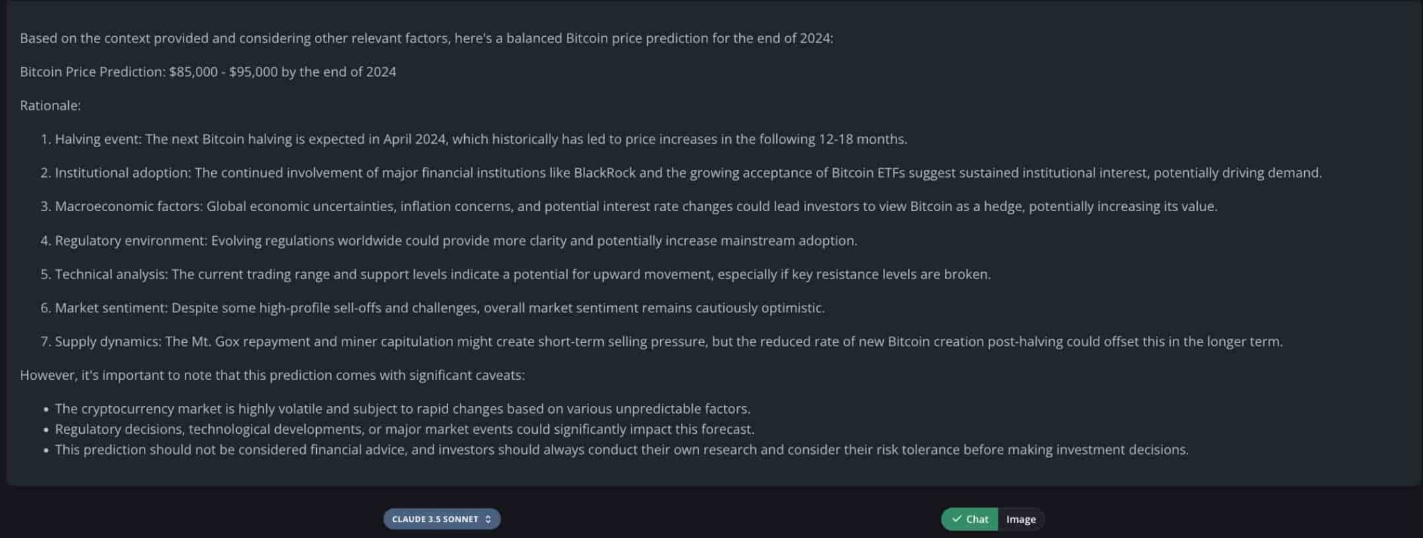 Yet, Claude 3.5 Sonnet can make mistakes, and its outputs rely on the data it was trained with and the provided context. Investors must take its analysis with caution and do further research before making financial decisions. Cryptocurrencies, including Bitcoin, are highly volatile assets, and things can change quickly in the market.