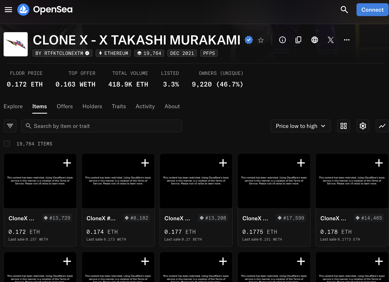 The art for all 19,500 Ethereum NFTs in the collection was replaced with a black background with white text that reads: “This content has been restricted. Using Cloudflare’s basic service in this manner is a violation of the Terms of Service. Please visit cfl.re/tos for more.”