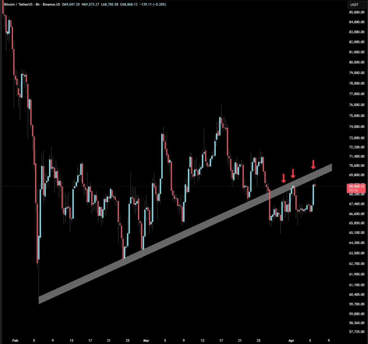 At the same time, the setup is still clear. A clean move above the trendline would weaken the rejection pattern and could shift momentum back toward buyers. Until then, traders will likely keep watching whether Bitcoin gets rejected again or finally breaks through the ceiling that has held since February.