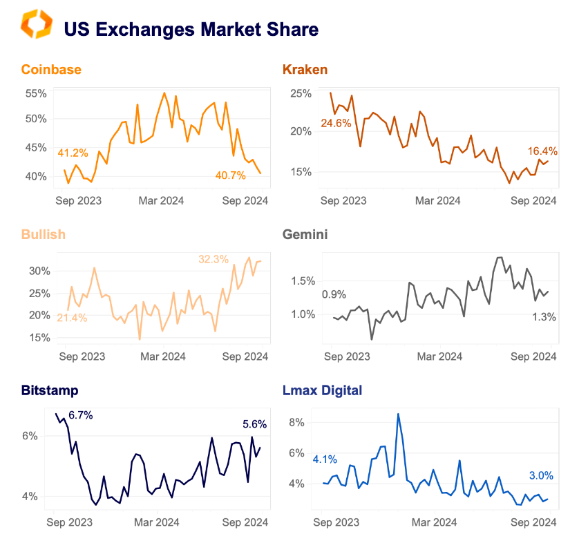 Coinbase dominated more than half of the US crypto market share earlier this year, peaking at almost 55% in March. However, its market share has since fallen to 41% in early September, down from 53% in June.