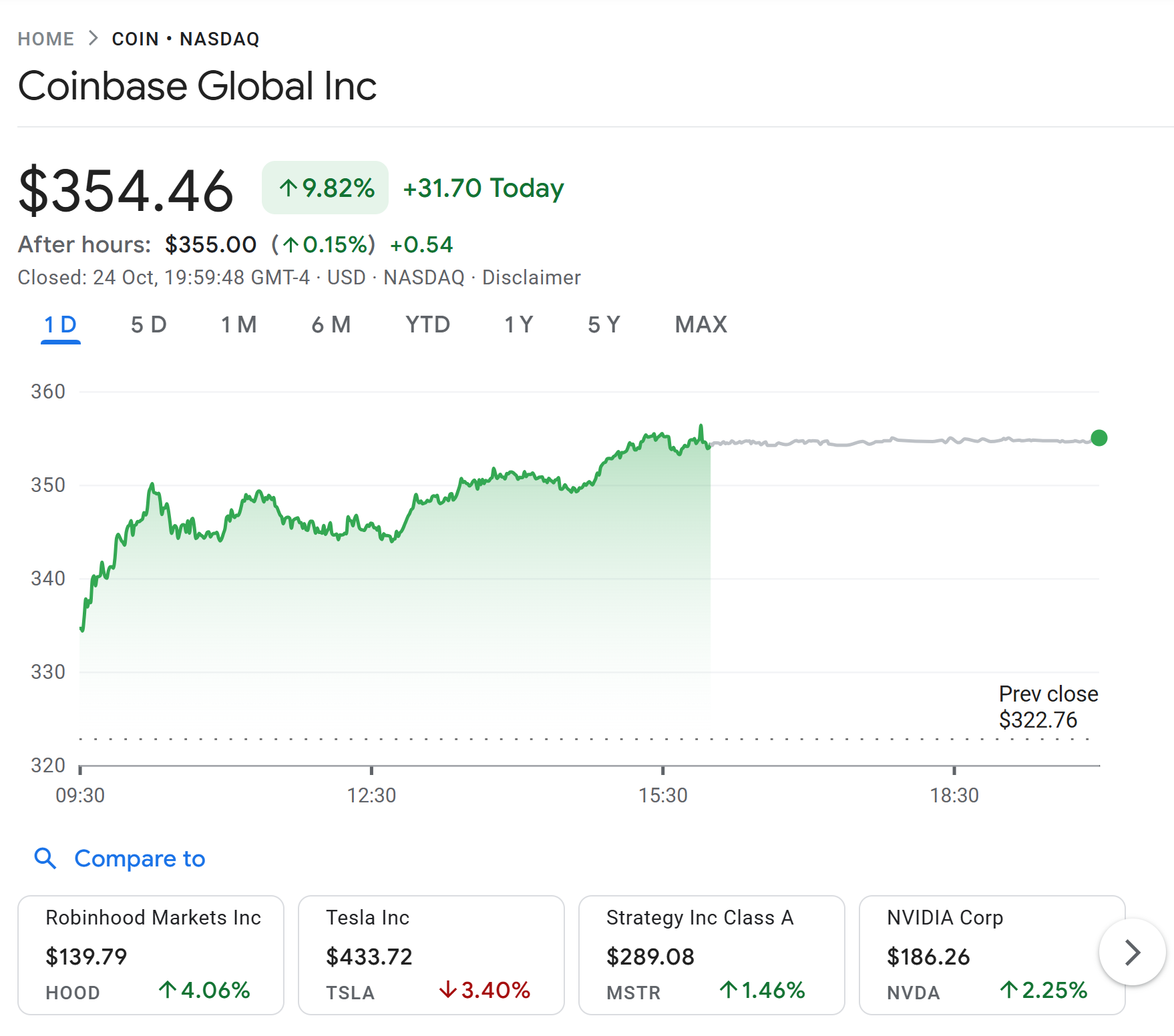 Coinbase shares ended Friday up by around 10%. Source: Google Finance