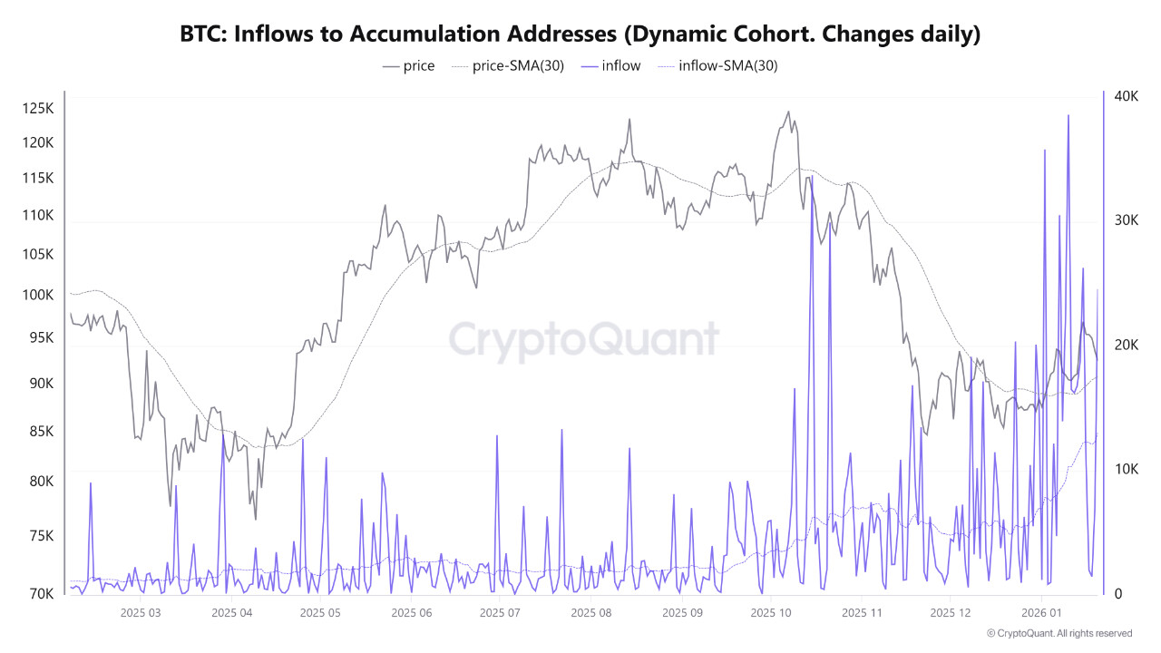 In October and November, inflows to accumulation addresses accelerated, with several sessions recording inflows of 20,000 BTC or more. The data shows that by the early days of the new year, daily inflows briefly reached the upper end of the observed range, nearing 40,000 BTC last week.
