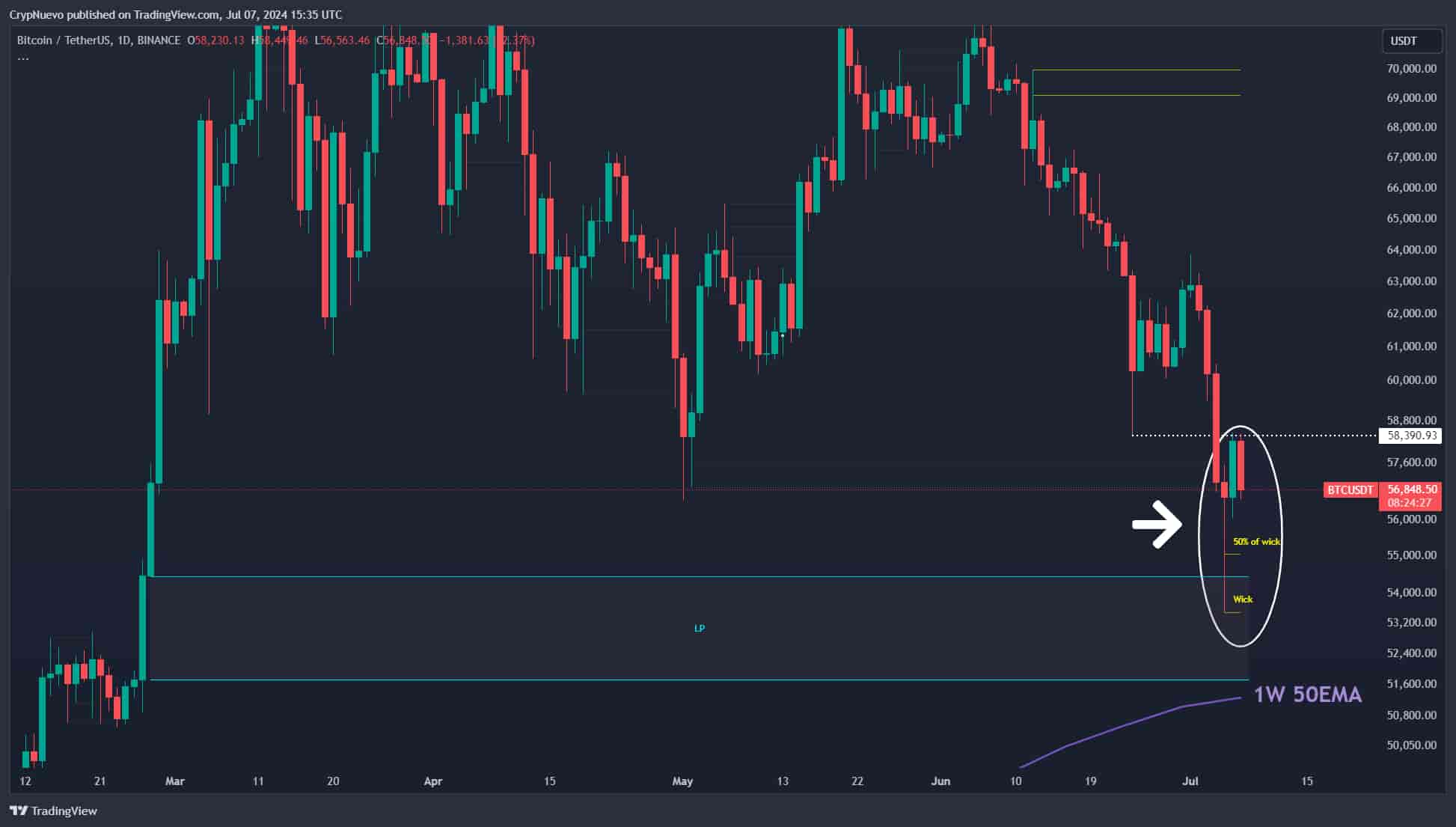 “We could then see first a drop to fill at least the 50% of the wick. It’s likely to see a bounce from the wick fill, but if we drop below the 100% of the wick level, then $51.7k should hold.”