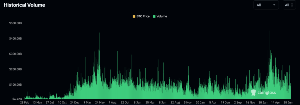 Monday’s report is part of a broader trend of declining volus since around March.CoinGlass data indicates that historical trading volumes have been decreasing for four months. This year’s highest trading volumes coincided with Bitcoin’s rally to an all-time high of $73,738, underscoring Bitcoin’s role as the primary driver for the digital asset market.