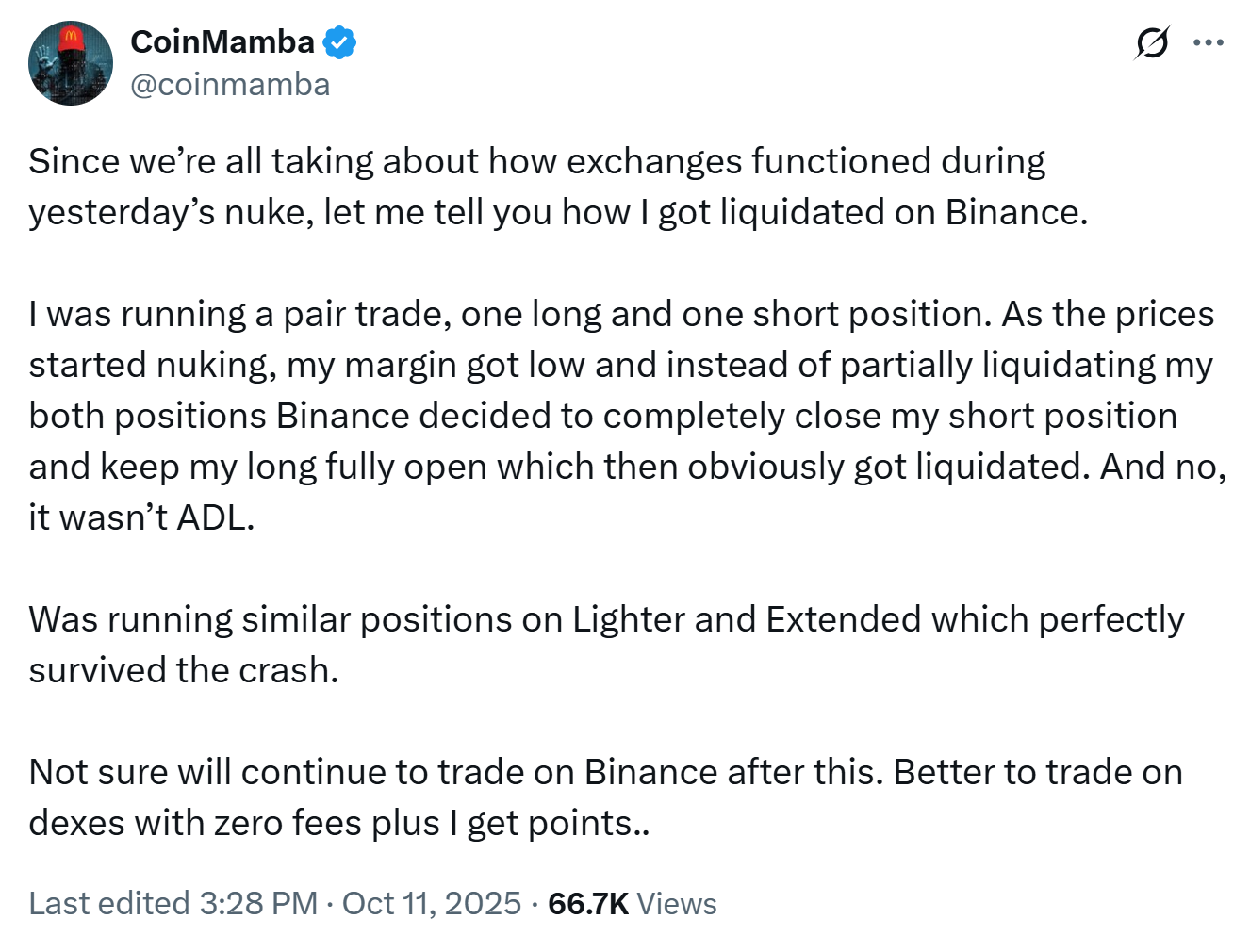The announcement came after some users reported loss due to platform errors. One Binance trader claimed the exchange fully closed their short position while leaving their long open, leading to a total loss. The user said the issue was not related to auto-deleveraging (ADL) and noted that similar trades on other platforms, such as Lighter and Extended, survived the crash.