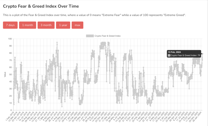 The Crypto Fear and Greed Index, a pivotal gauge of market sentiment, has soared to unprecedented levels since Bitcoin’s all-time high. Recent data reveals that on February 13, the index surged to 79, marking its highest point since mid-November 2021, when Bitcoin skyrocketed to $69,000.