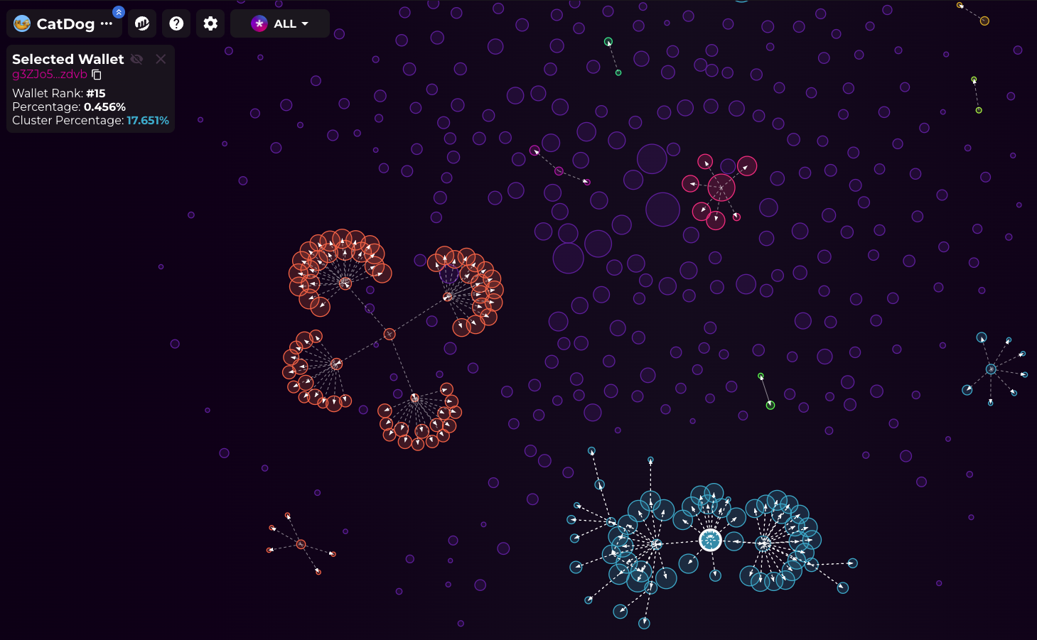 Blockchain analytics firm Bubblemaps has issued warnings regarding CATDOG’s market movements. Their research reveals that 140 connected wallets hold 40% of the coin’s supply, a classic red flag in the crypto sector. For instance, one wallet, g3ZJo5, initially sniped CATDOG’s supply, quickly distributing parts to 60 other wallets while retaining 17.7%.