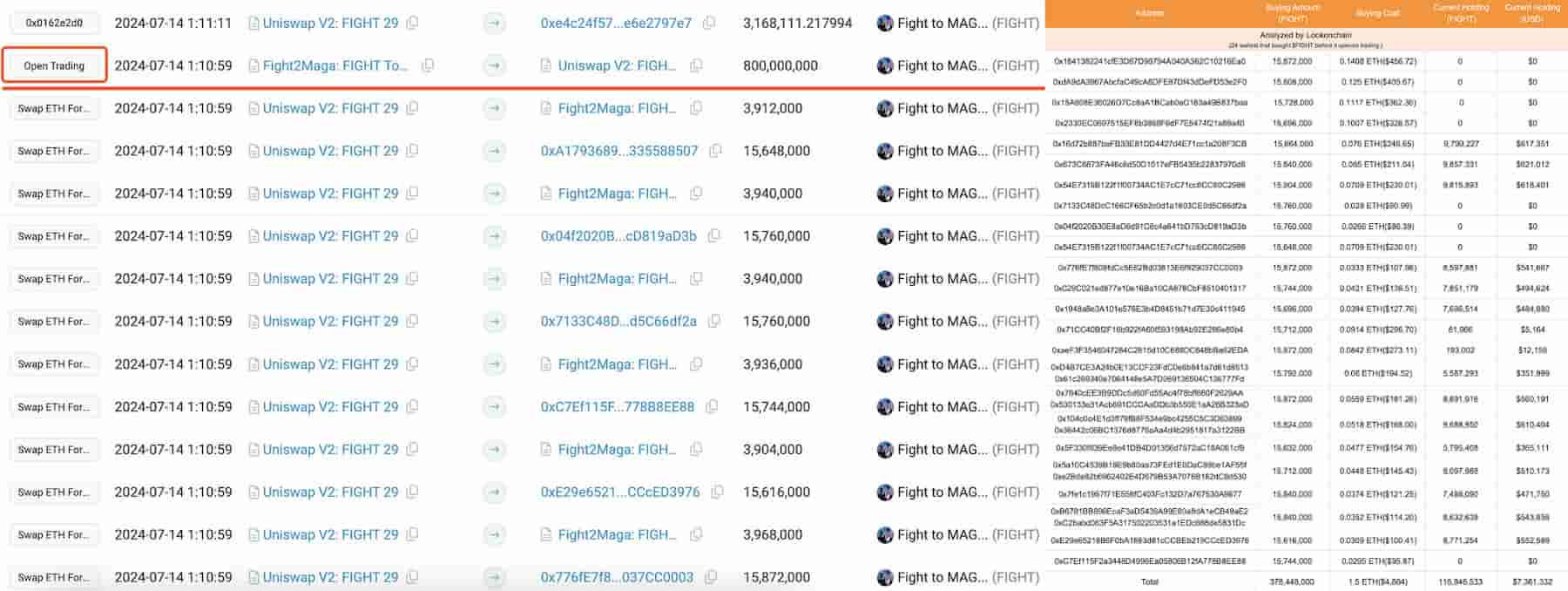 According to Lookonchain, these 24 addresses spent 1.5 ETH, worth $4,864, to buy 378.45 million $FIGHT. This amount represents 37.8% of the token’s total supply, and the wallets made the purchase before $FIGHT opened trading.