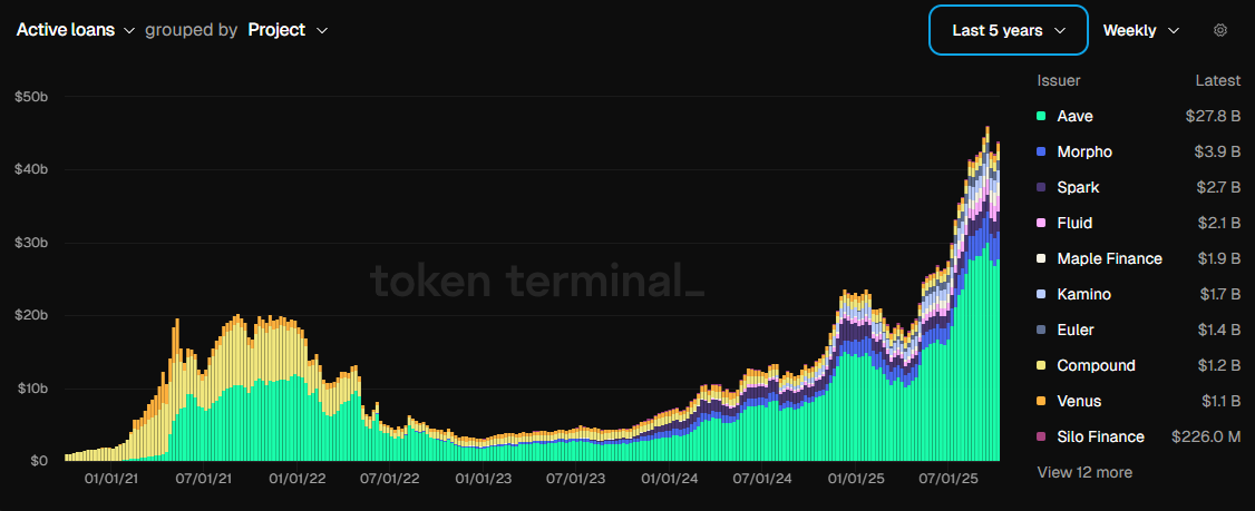 Crypto lending has evolved since 2021, doubling in value since the peak of the previous bull market. In total, lending protocols hold over $46B in active loans, up from around $20B at the peak of the market in 2021.