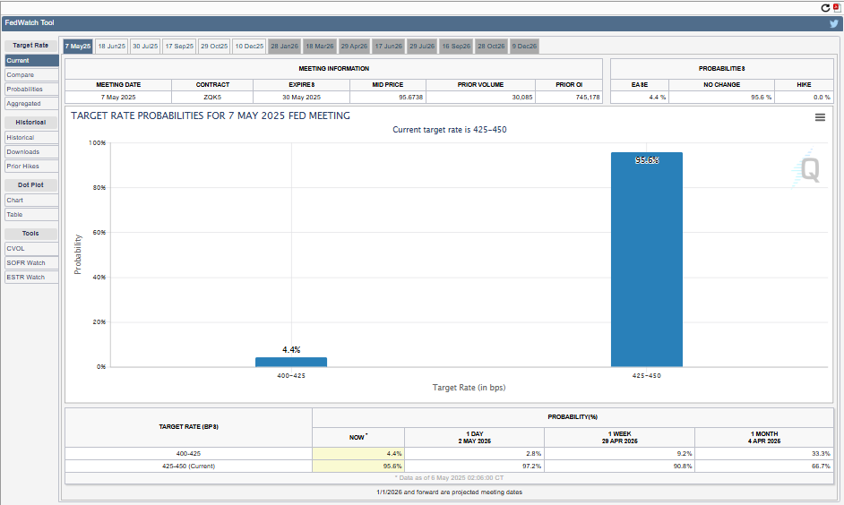According to data on the CME FedWatch Tool, market participants assign a 95.6% probability that the Fed will hold rates steady at 4.25% – 4.5%. With this, attention is now squarely focused on Fed Chair Jerome Powell’s tone and guidance at the Wednesday conference.
