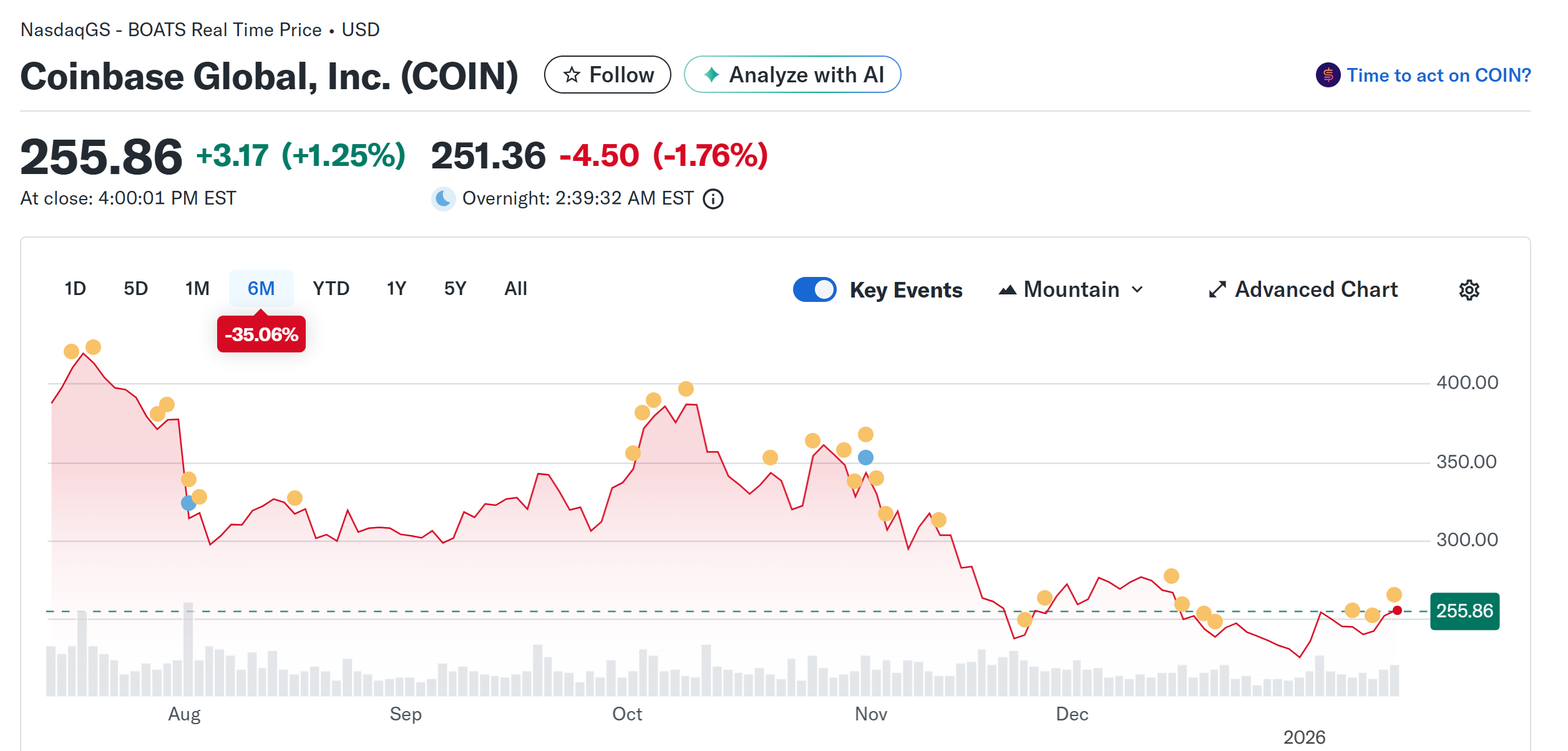 Coinbase stock performance over the last six months. Source: Yahoo Finance