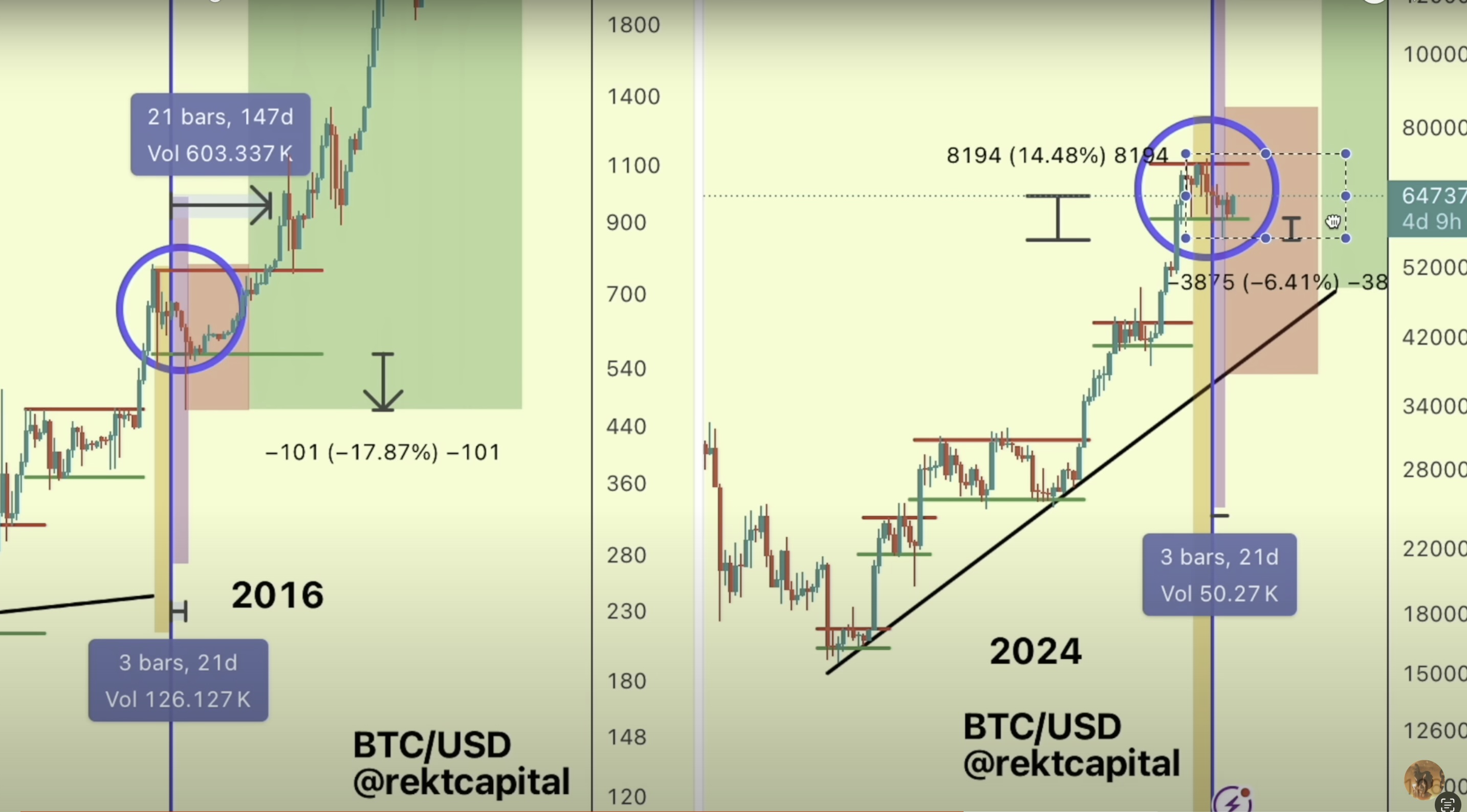 The analyst pseudonymously known as Rekt Capital tells his 76,900 YouTube subscribers that based on historic precedence Bitcoin has left the phase, or “danger zone,” when there is a likelihood of a dip below its range low after the halving event when miners’ rewards are cut in half.