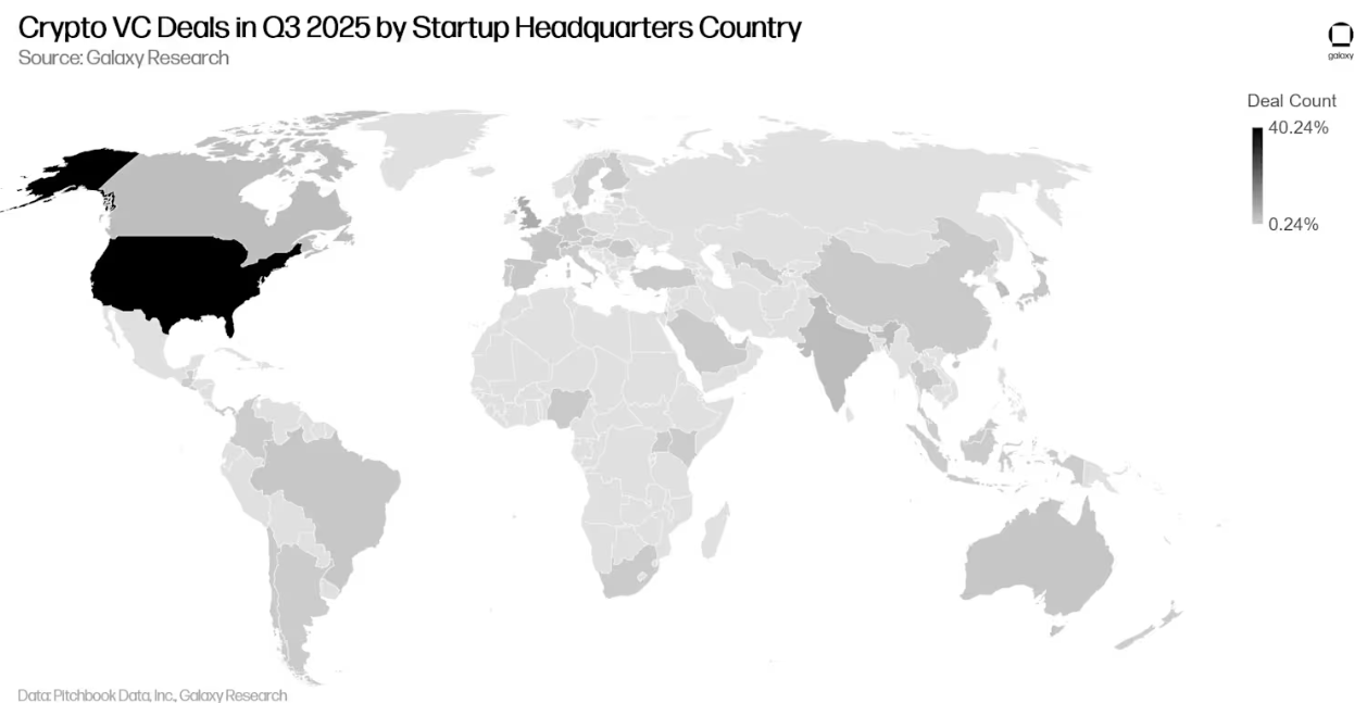 The US has historically accounted for the most deals and capital invested, a trend that has continued into Q3 2025. Source: Galaxy Digital