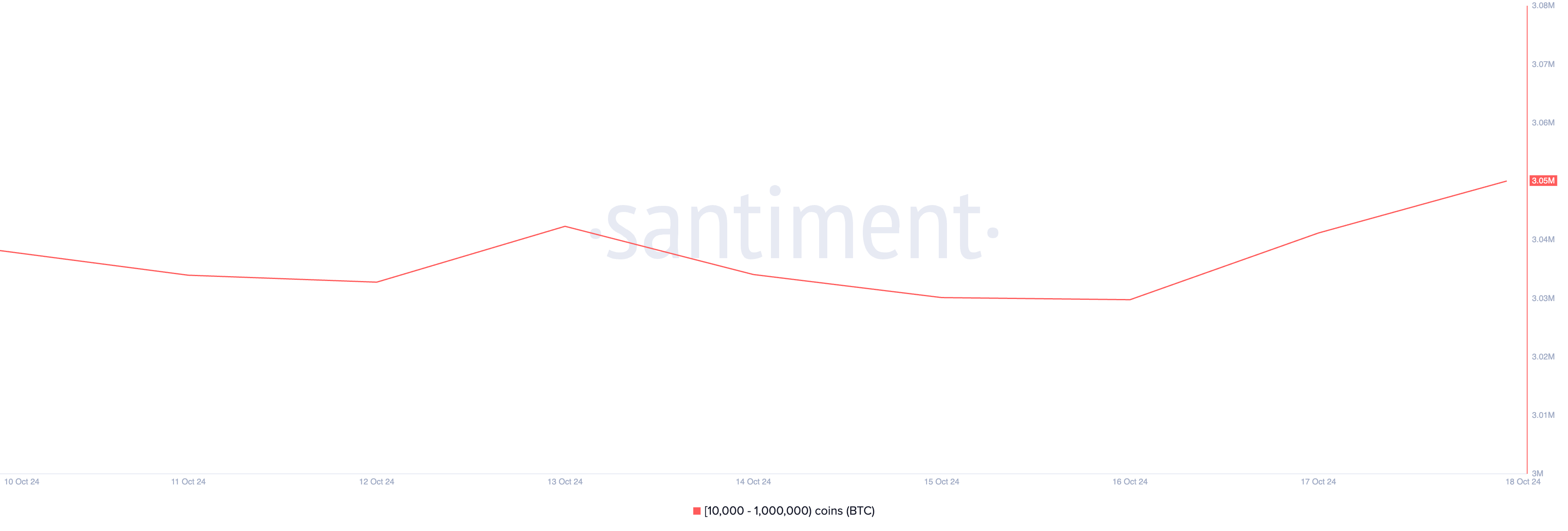 Over the past seven days, crypto whales that hold between 10,000 and 1,000,000 coins have added 20,000 coins valued above $1.35 billion at current market prices. This cohort of BTC investors currently holds 3.05 million coins.