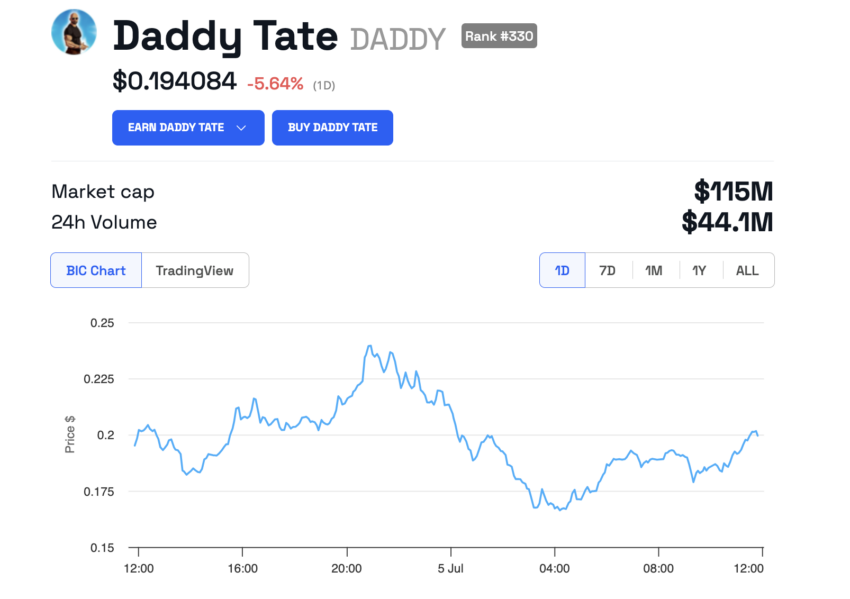 Contrasting Bitcoin’s recent decline to $53,500, Andrew Tate’s Daddy Tate (DADDY) meme coin demonstrates resilience, suffering only a modest 5.64% drop over the past 24 hours. This occurs as the broader cryptocurrency market crashes, with major players like Ethereum (ETH) and Solana (SOL) taking sharp dives.