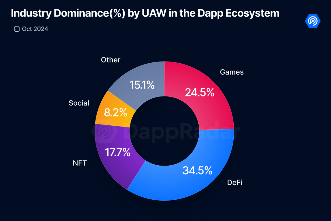 “In a notable shift, the gaming sector has lost its leading position within the DApp industry, now outpaced by DeFi. This rise in DeFi usage reflects not only October’s market activity but also highlights the impact of the U.S. elections in early November, which contributed to a surge in trading, particularly around meme coins.”