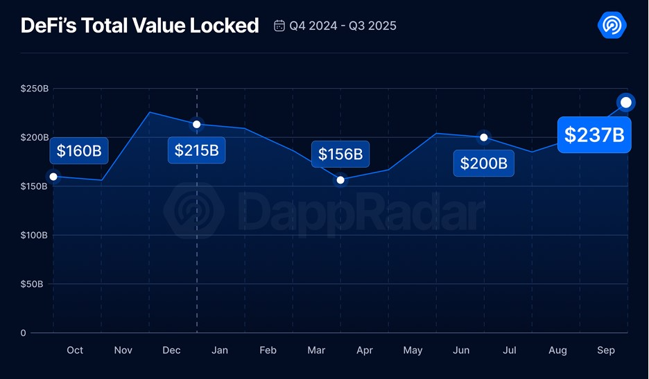 DeFi’s total value locked in the third quarter of 2025. Source: DappRadar