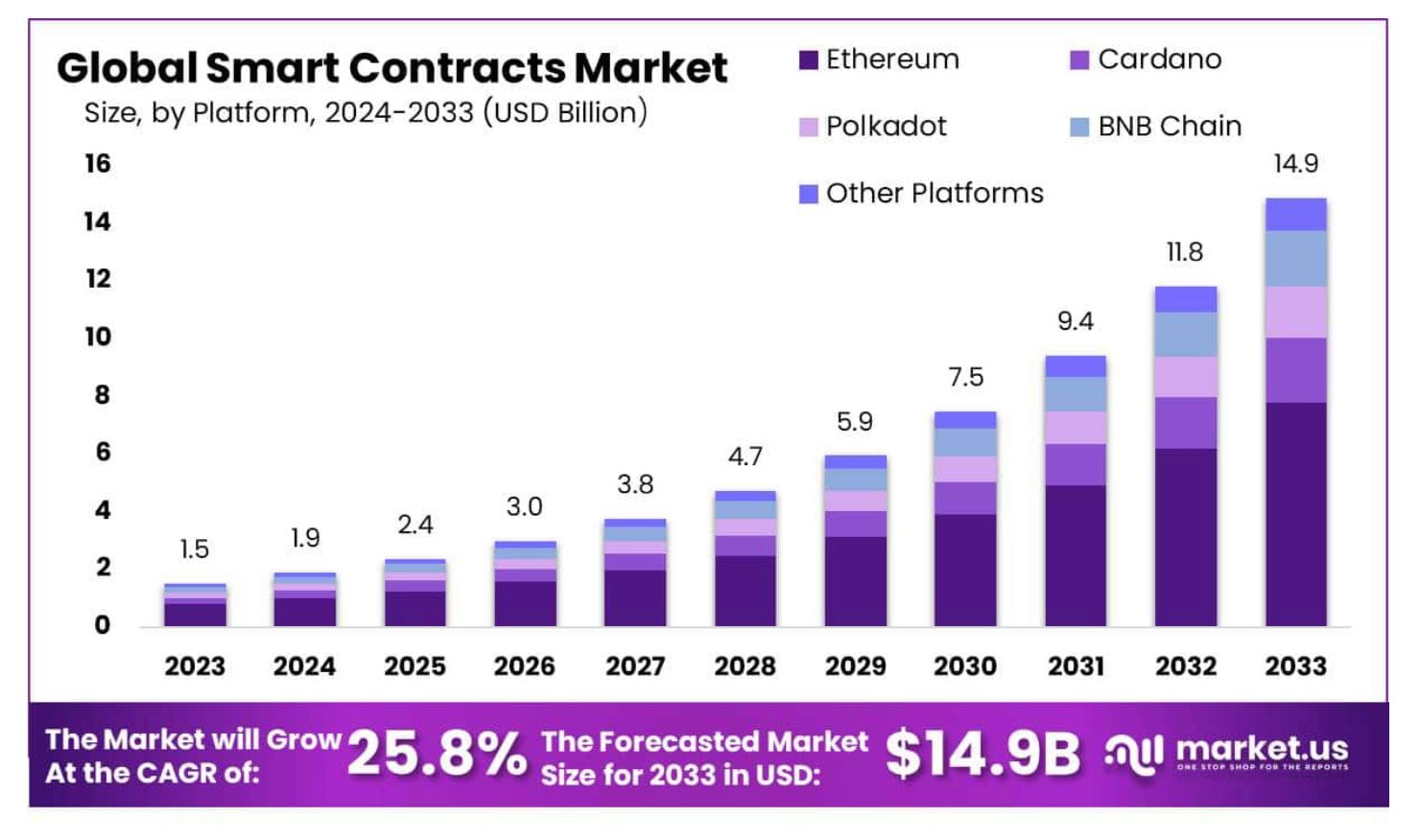 The global smart contract sector is expected to be almost $15 billion by 2033. Source: Market.us