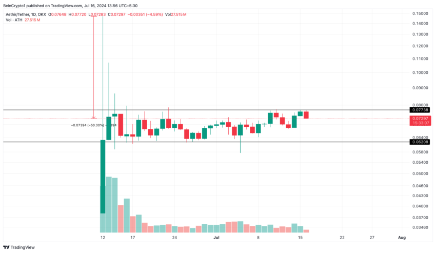 Despite these advancements, ATH’s price performance has struggled since its crypto exchange listing. After reaching a high of $0.14700 last month, the price has dropped by about 50%. Currently, it oscillates between $0.07738 and $0.06208.