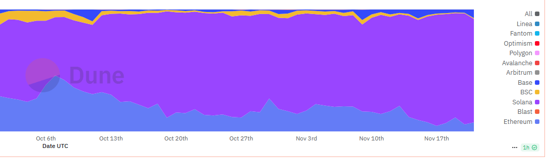 Solana remains a bot-driven network, with an almost constant DEX bot war. This means even a small increase in DEX activity will boost the challenges between bots. Solana carries more than 82% of overall trading bot status, up from 47% in October.