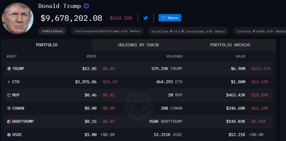 The former U.S. president possesses 579,000 TRUMP meme coins, valued at $6.9 million, and 464.3 Ethereum tokens, worth $1.8 million. Other meme coins he holds with values exceeding $100K include CONAN and BABYTRUMP.