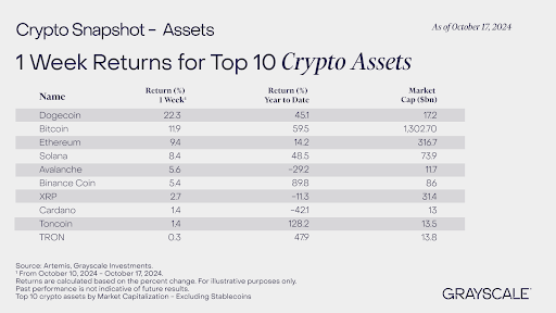 Dogecoin Leads Weekly Gain with 22.3%, followed by Bitcoin and Ethereum