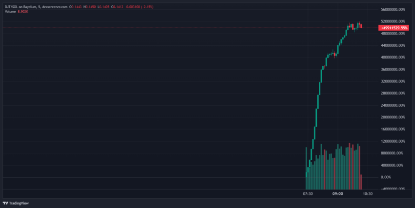 This news has significantly impacted Trump-related meme coins, with the newly minted TrumpCoin (DJT) skyrocketing by nearly 50,000,000% in less than three hours, pushing its market capitalization to $143.1 million. Similarly, another meme coin, Satoshi Trump (MBGA), saw a dramatic increase of over 7,900%, reaching a market cap of $2.8 million.