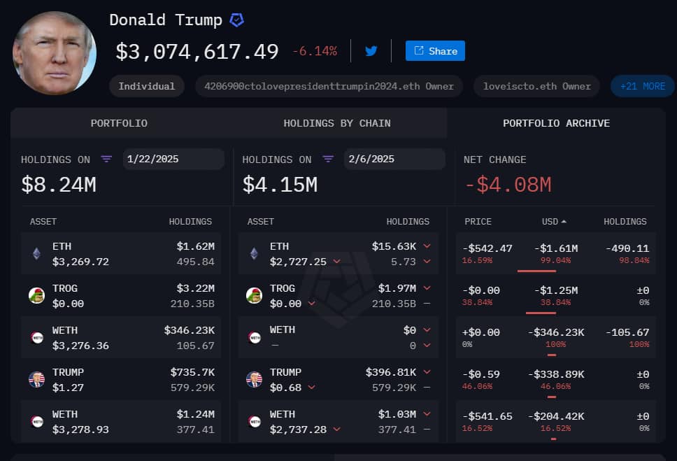 Indeed, Donald Trump’s ETH balance dropped from nearly 500 to just under 6 between January 22 and press time on February 6.