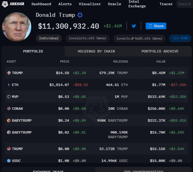 According to Arkham data, Trump’s wallet exceeded $11 million.