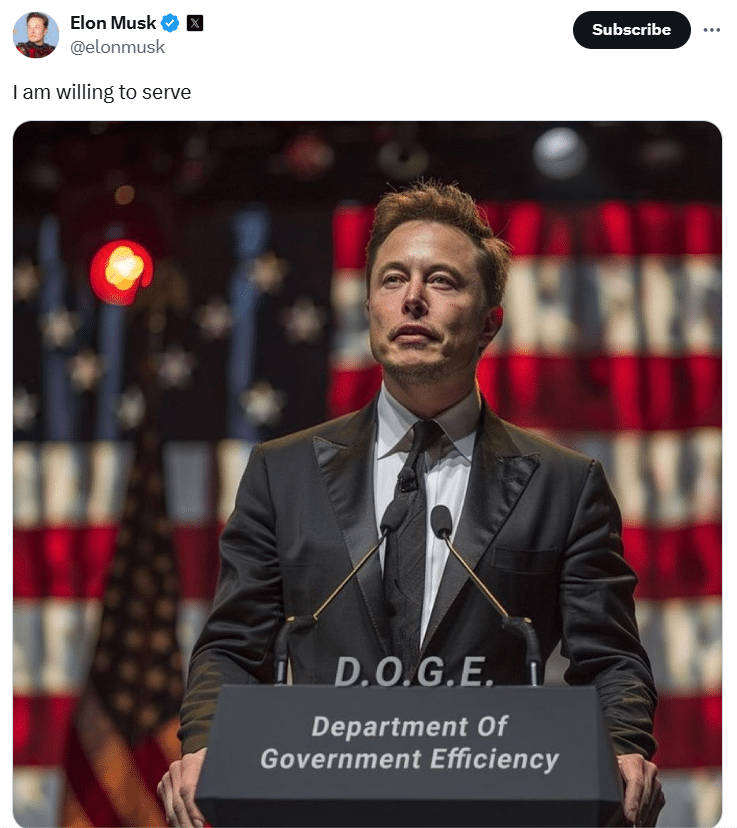 Along with the caption, Musk posted what looked like an AI-generated picture of himself on a podium inscribed with “Department Of Government Efficiency (D.O.G.E.).” The tweet has gained popularity on X, with Dogecoin enthusiasts particularly pointing to the D.O.G.E. acronym.