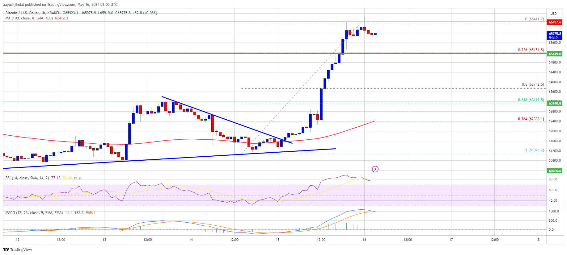 The pair rallied over 6% and broke many hurdles near the $63,500 resistance. It even cleared the $65,500 resistance. A new weekly high was formed at $66,411 and the price is now consolidating gains.