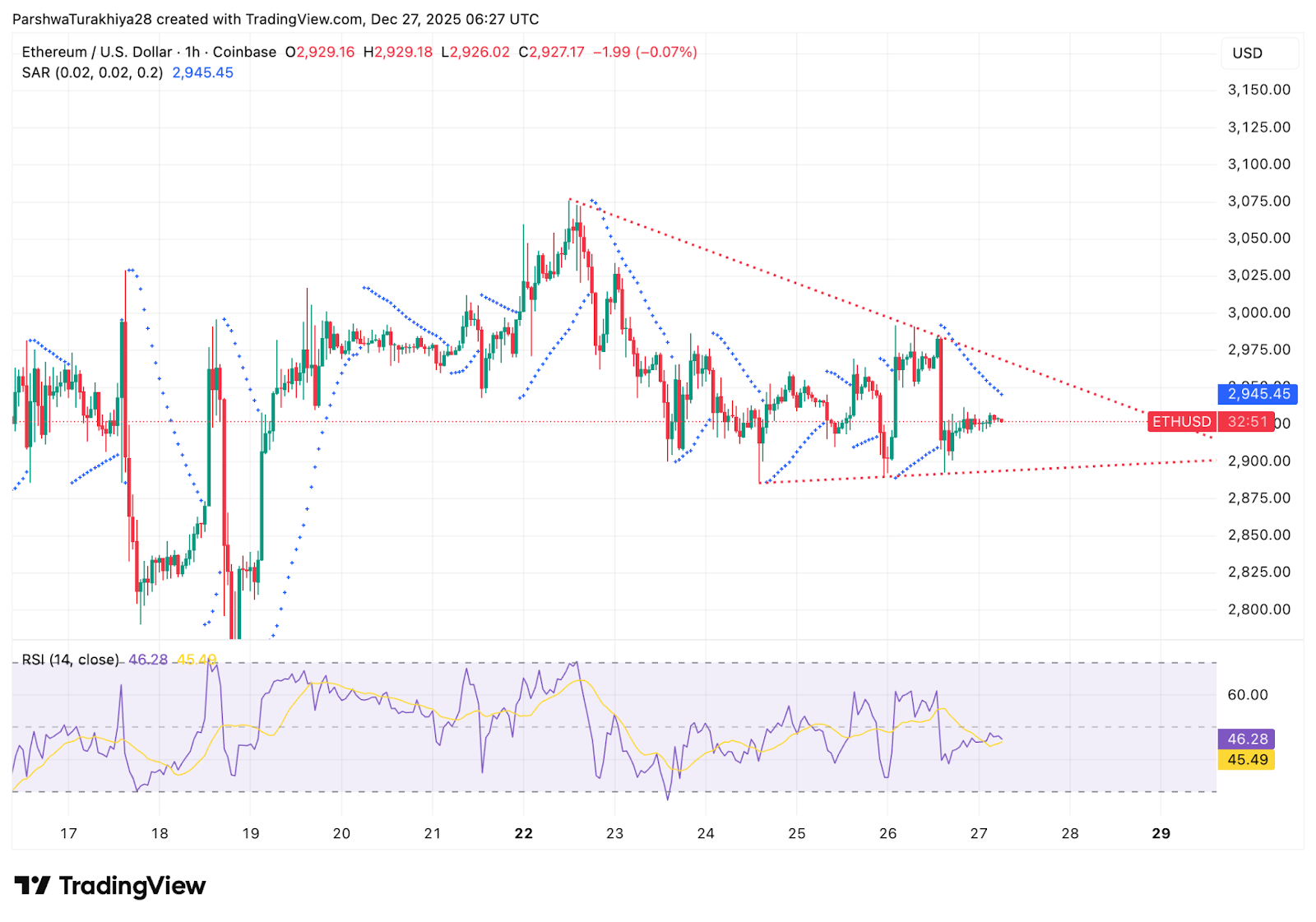 On the one-hour chart, ETH is compressing inside a narrowing range between $2,900 and $2,980. Parabolic SAR dots remain above price, keeping short-term pressure intact, while RSI hovers in the mid-40s, reflecting neutral momentum.